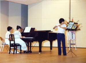 | この頃の音楽活動は吹奏楽だけではありません。フルートの方にもかなりのめり込んでいました。 写真は8月23日、夏期補講初日のテストを途中で抜け出し、教育文化会館での演奏会に出演した一コマです。 |