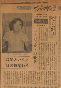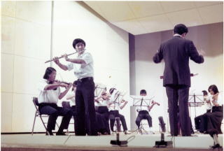 | 1年5組の担任は英語のS先生でした。笛吹ねこの英語嫌いはこの1年時の体験のトラウマによるものと言えます(とはオーバーか?) 授業中には『ぺっぺ吹き』と呼ばれ、『ぺっぺばっかり吹いとらんと勉強せんかい』といつもののしられておりました。 しかし、その迫害にも負けず、授業中にかなりの時間を費やして作曲したのが『フルート協奏曲』です。 作曲は5月から7月にかけて行いましたが、一度数学の授業中に机を傾けてしまい、書きかけの楽譜が床にちらばり危ういところでばれそうになったことがあります。(楽譜にはいまでも床の汚れがしみとなってのこっています) 右の写真は夏休みのフルートコンサートで自作を初演しているところです。 この件は9月27日に北日本新聞の夕刊に載ることになり、S先生の説教に油を注ぐことになります。 |