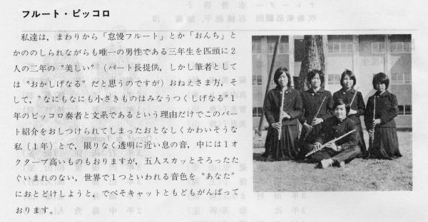 | これはスプリングコンサートのプログラムに掲載されたパート紹介です。 ご覧のようにフルートパートはほとんどが女性で、笛吹ねこ(中央)は後輩を侍らせ、ほとんどハーレム状態で毎日を過ごしているかのように見えます。 しかし、当時の後輩曰く『練習は厳しくて、毎日が怖かった 特に、空き教室での個別レッスンは』と申しております。(特に左側の二年生2人) ちなみに筆者は後列右から二人目の当時1年生です。 ![]() |