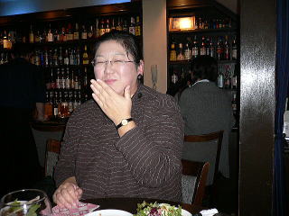 | §3 理恵さんよくしゃべる。 岩手県は四国ほどでかい。山が低い。冬さぶい。北上市に住んでいる。富山まで車で来る。お母さんは新潟中越地震の現場を数十分前に通過した強運の持ち主。児童心理、老人心理などの講師をしている。などなど。ここへ黒瀬さん登場。今度はワインで乾杯。 |