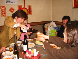 §1 YUMIKAの隣は誰だ? さて、約20分の遅刻で待ちぼうけをくらった哲ちゃんと組長、既に本日の会場中華料理「三煕」に陣取り美女軍団の到着を今か今かと待ちかまえておりました。ここで問題になったのは座る場所。YUMIKA女王様の隣は畏れおおくて(^_^;)、 2回休み分のフラストレーションが心配です。 |